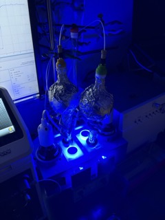 青色光照射で光触媒反応を追跡中