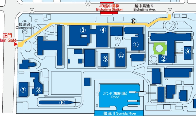詳しくはこちら①オモシロ講演 ②プラネタリウム ③錨水槽、海図室 ⑤操船シミュレータ ⑥明治丸 ⑦明治丸記念館 ⑧百周年記念資料館 ⑨マリンカフェ(当日休業) ⑩駐輪場スペース ⑪図書館