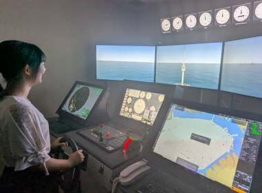 本物そっくりの操船体験! 本学の実際の授業や研究でも使われている操船シミュレータを体感しよう!本物の船のような操作感で航海の楽しさと難しさを体験できます。