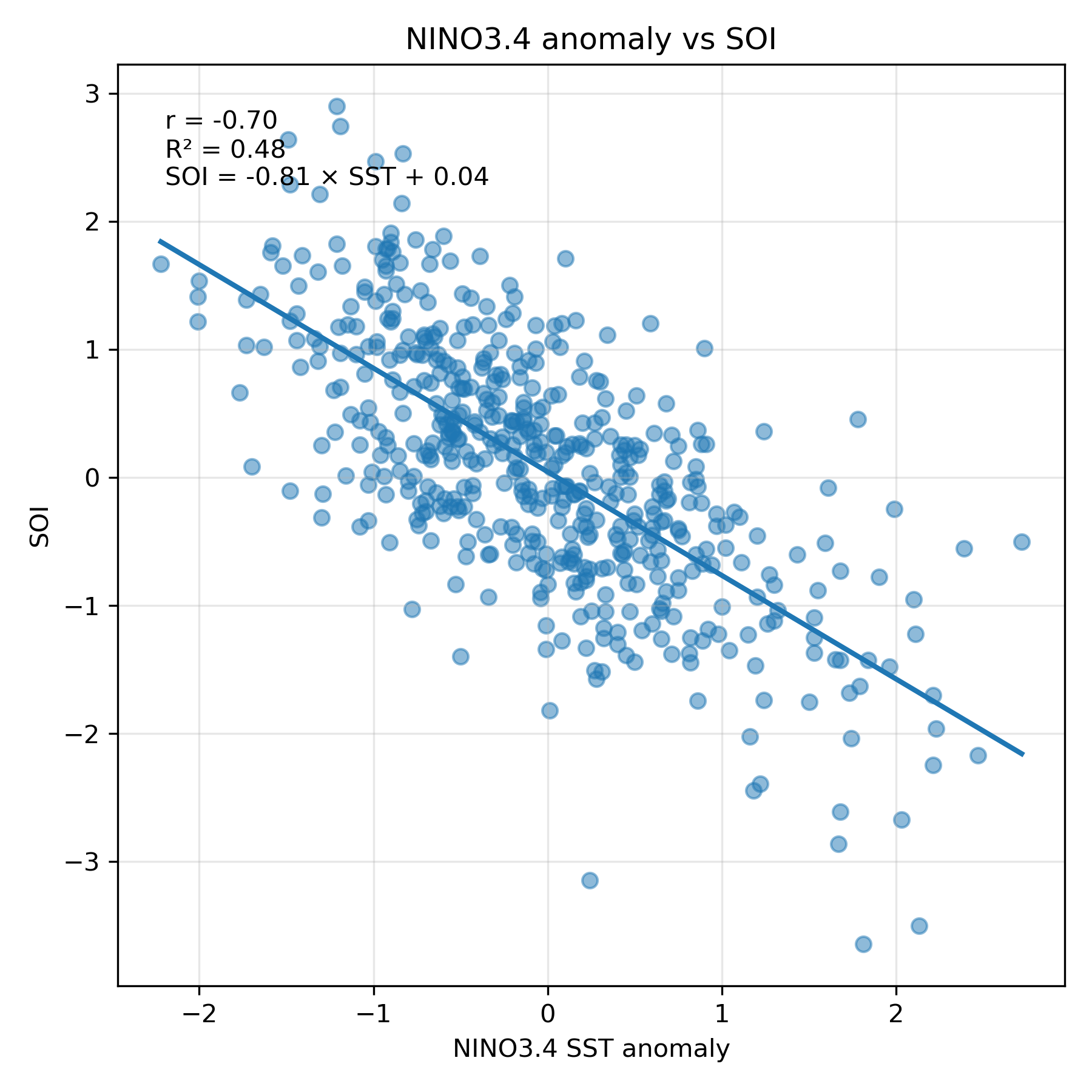 注意すべきことは、SOI のデータは 2025 年 3 月までであり、SST 側はそれ以降まで含む場合があることである。したがって、解析には必ず 共通期間だけ を使う。