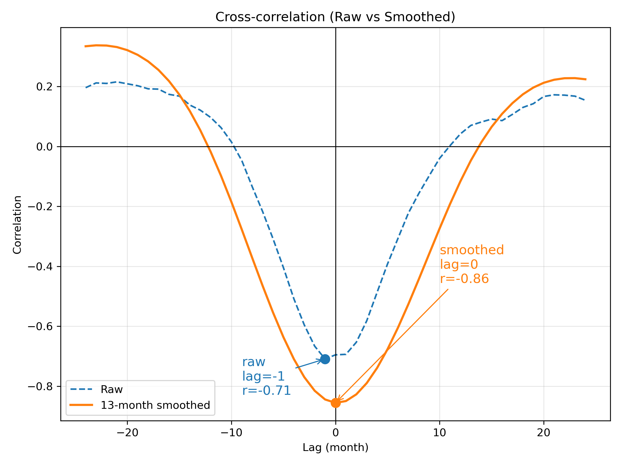 生データのままだと月ごとのゆらぎが大きいので、13か月移動平均をかけた後でもラグ相関を求める。ここでは 121か月移動平均は使わず、短周期のノイズを弱めるための 13か月平滑化だけを使う。