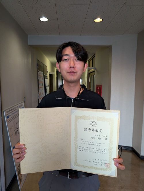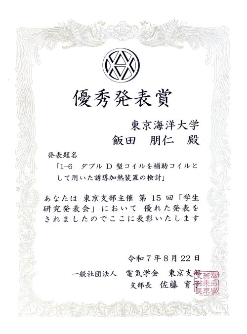 学部4年生の飯田朋仁が一般社団法人電気学会東京支部カンファレンス第15回学生研究発表会で優秀発表賞を受賞しました。おめでとうございます!