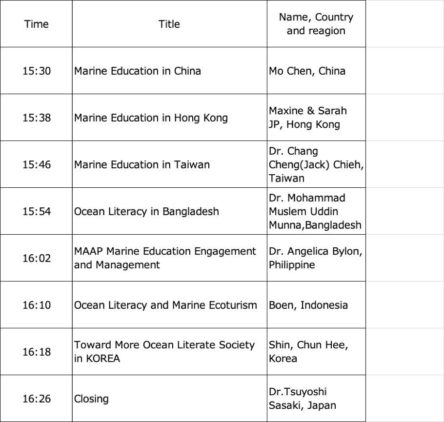 Session 2: The members of Asian Marine Educators Association will collaborate to introduce each activities from Bangladesh, China, Indonesia, Hong Kong, Korea, Taiwan, Philippine.